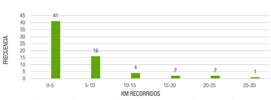 Para cumplir el primer objetivo, se analizó la distancia recorrida entre el domicilio del hurtador y el lugar del delito, y si existía una relación de dependencia entre este, el sitio y la hora. Se excluyeron cinco casos de la muestra, porque en los atestados no se recogía la ubicación del domicilio del sujeto; es decir, se realizó este análisis con la información de 66 infractores.