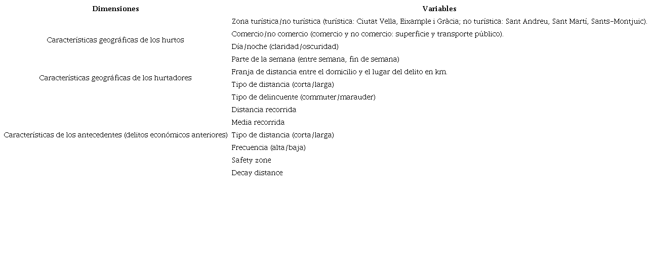 En la creación de este instrumento de recogida de datos se tuvieron en consideración las características geográficas de los hurtos, así como el perfil de los delincuentes y sus antecedentes penales (tabla 1).