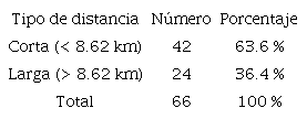 Tipo de distancia: corta o larga, se calculó realizando la media aritmética de las medias calculadas en el apartado anterior (media recorrida), las medias recorridas del domicilio del hurtador hacia cada uno de sus robos anteriores y al hurto principal. De cada una de estas medias se calculó nuevamente la media aritmética, dando un resultado de 8.62 km. Esta distancia se estableció como punto medio, es decir que las distancias que se encuentran por encima de la media son largas y las que están por debajo son cortas.