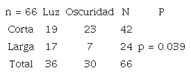 Luz u oscuridad: esta clasificación se estableció en función de si todavía hay luz solar o no (claridad/oscuridad) en el momento del delito; esta clasificación l a utilizaron Tompson & Bowers (2013) para definir si la oscuridad influye en el número de hurtos, o si por el contrario se cometen más delitos durante el día. Para ello, se han considerado cuáles eran las horas de sol durante las fechas que se recogió la muestra (entre el 1 y el 10 de marzo del 2020), resultando ser las horas de sol las comprendidas entre las 6:00 y las 18:00 horas y, el resto horas sin luz natural (oscuridad).