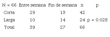 Los hurtadores que recorren distancias cortas actúan entre semana y, en cambio, los que recorren distancias más largas roban durante el fin de semana (X2 (1) = 4.737; p = 0.028; V = 0.030) (tabla 6 y figuras 6-7). La diferencia es estadísticamente significativa (tabla 6).