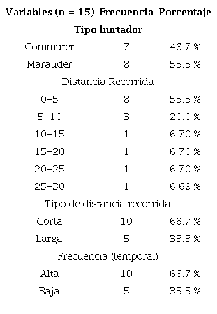 Los 15 ladrones seleccionados según el número de antecedentes se dividen equitativamente entre commuters y marauders (tabla 7). La mayoría recorren poca distancia, menos de cinco kilómetros (53.3 %) y hurtan de forma recurrente, dejando pasar poco tiempo entre hurtos (66.7%) (tabla 7).