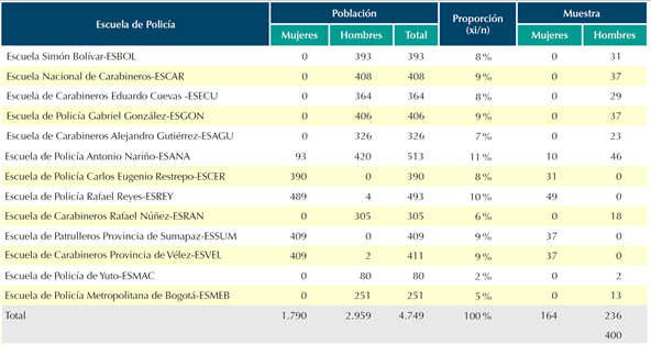 La población de esta investigación comprende 4.749 estudiantes de policía de trece escuelas a nivel nacional, de los cuales 1.740 eran mujeres. Se utilizó una muestra aleatoria estratificada de 400 discentes, se determinó un nivel de confianza del 95 %, un error de estimación de 0.05 % y una probabilidad de éxito del 0.5 %.