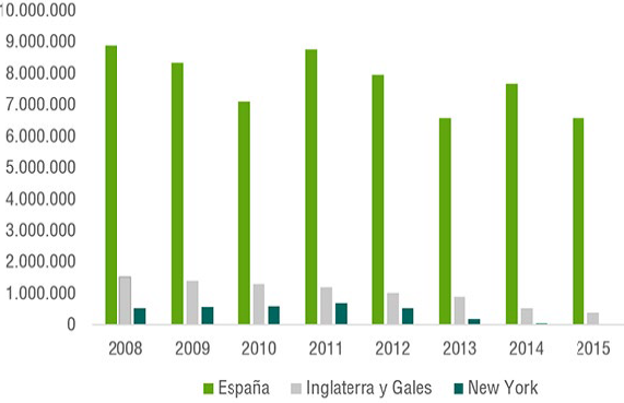 En la figura 1 puede observarse la evolución de las identificaciones policiales llevadas a cabo en España, Inglaterra, Gales y Nueva York entre 2008 y 2015. En primer lugar, es preciso tener en cuenta que no se dispone de datos accesibles sobre identificaciones a nivel nacional para el resto de los periodos. El número de identificaciones anuales en España está entre los nueve y los seis millones, mientras que en el Reino Unido el número de identificaciones anuales oscila entre los veintidós mil y el millón y medio, y en Nueva York se encuentra entre las veintidós mil y seis cientos mil identificaciones respectivamente (figura 1). Esta información solamente permite reflejar los datos a modo global y proviene de información oficial proporcionada por los distintos anuarios estadísticos del Ministerio del Interior (MIR, 2008; MIR, 2009; MIR, 2010; MIR, 2011; MIR, 2012; MIR, 2013; MIR, 2014 & MIR, 2015), el Boletín anual estadístico sobre poderes y procedimientos policiales en Inglaterra y Gales (2017), y el Informe de Unión de Libertades Civiles de Nueva York (2019).