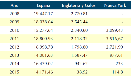Para saber si existe una tasa elevada de identificaciones, se puede establecer una comparación entre las identificaciones realizadas por la policía en España y las prácticas análogas de policías en otros contextos. Entre 2008 y 2015, España tuvo una tasa elevada de identificaciones por cada cien mil personas. Estas cifras son bastante altas si las comparamos con otros países como, por ejemplo, Reino Unido y Estados Unidos (Nueva York), los cuales presentaron tasas inferiores por cada cien mil habitantes durante los mismos periodos respectivamente (tabla 1).