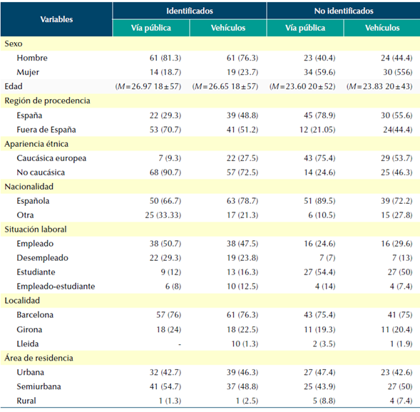 En relación con las paradas en vehículos, la mayoría de los identificados tenía una edad promedio de 26.65 años. El 76.3 % eran hombres y el 23.7 % mujeres. Asimismo, la procedencia de la mayoría es del exterior 51.2 % mientras el 48.8 % son de origen español. Respecto a la situación laboral, el 47.5 % son empleados, el 23.8 % desempleados, 26.3 % estudiantes y 12.5 % estudiantes que trabajan. En relación con la localidad, los identificados residen en su mayoría en Barcelona 76.3 %, seguido de Girona 22.5 % y Lleida 1.3 %. Del mismo modo, 48.8 % residían en áreas semiurbanas, 46.3 % en áreas urbanas y 2.5 % en áreas rurales. En cuanto a la etnia, la mayoría presenta rasgos no caucásicos 72.5 % y 27.5 % caucásicos. Por último, 78.7 % son nacionales y 21.3 % extranjeros.