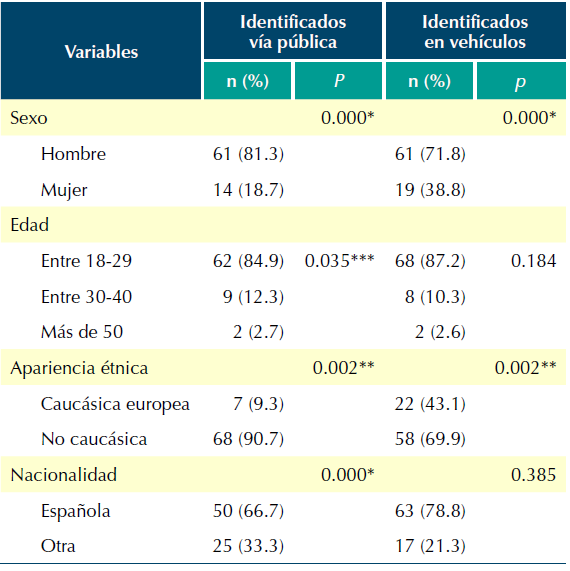 Respecto a la apariencia étnica, la identificación en vía pública se haya efectivamente en una relación significativa con un tamaño del efecto elevado (χ2 = 60.145; gl = 1; p < 0.05). Las personas con apariencia no caucásica representan un 9.3 % de las identificaciones en vía pública, mientras que las personas con rasgos no caucásicos representan un 90.7 %. Asimismo, si desglosamos estos datos en función de la apariencia no caucásica, se destaca que el 100 % de las personas de etnia gitana y sudafricana son identificadas en la vía pública, seguido del 75.7 % de los magrebís y el 60 % de latinos. En cuanto a las identificaciones en vehículo, los análisis estadísticos muestran diferencias significativas con un tamaño del efecto bajo (χ2 = 9.390; gl = 1; p < 0.05). Las personas con rasgos no caucásicos representan un 69.9 % de los identificados frente al 43.1% de los caucásicos. Si desglosamos estos datos en función de la apariencia no caucásica, encontramos que el 38.7 % son magrebís, seguido del 11.3 % de etnia gitana, el 8.8 % son de sudafricanos y el 7.6 % latinos.