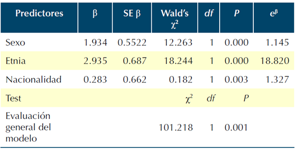 Los resultados estadísticos muestran que en este modelo únicamente son predictores significativos sexos (b = 1.934; Wald χ2 (1) = 12.263; p < 0.01); etnia (b = 2.935; Wald χ2 (1) = 18.244; p < 0.05); y nacionalidad (b = 0.283; Wald χ2 (1) = 0.182; p < 0.05).