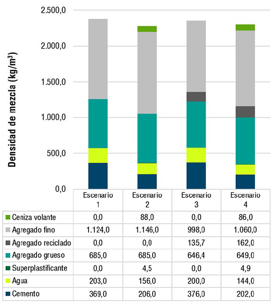 En la figura 1 se presentan los diseños de mezcla (kg/m3) planteados por escenario. Cada diseño fue planteado y validado para la resistencia a la compresión de los concretos estructurales del proyecto, correspondiente a 24 MPa. Se observan ligeras variaciones en la densidad final de las mezclas, atribuidos a las sustituciones mencionadas, resaltando que el diseño más denso es el del escenario 1 y el menos denso el del escenario 2. Para efectos de la investigación, el concreto planteado en el escenario 1 tiene la característica de que puede ser preparado in situ, pero los concretos planteados para los escenarios 2, 3 y 4 corresponden a concretos premezclados. Esto se debe en los escenarios 2 y 4 a la disponibilidad de ceniza volante y en el escenario 3 al cuidado que se debe prestar en la resistencia final a la compresión debido a la incorporación de RCD.