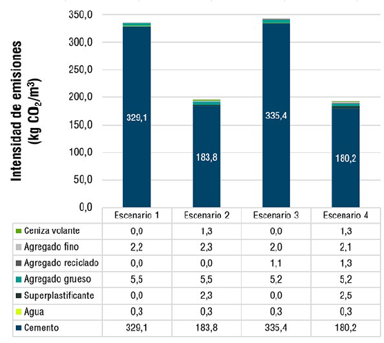 En la figura 2 se muestra la intensidad de emisiones (kg CO2/m3) de los materiales para los diseños de mezcla planteados por escenario. Como se observa, el cemento es el material que mayor generación de emisiones presenta en todos los escenarios, asociado tanto a su elevado factor de emisión como a su elevada intensidad material. Debido a esta razón, los diseños de mezcla de concreto de los escenarios 2 y 4, en los cuales se llevó a cabo inclusión de superplastificante y sustitución parcial de cemento por ceniza volante, son los escenarios de menor huella de carbono por metro cúbico. Como se presenta en el escenario 3, la sustitución parcial de agregados vírgenes por agregados reciclados no representa una disminución en la huella de carbono, debido a que las emisiones asociadas al procesamiento de RCD para generar nuevos agregados son muy similares a las necesarias para procesar agregados vírgenes. No obstante, el escenario 3 no debe ser descartado en su totalidad, ya que, si se analiza desde el punto de vista del agotamiento de recursos naturales y el respectivo impacto de su explotación, siempre será más conveniente usar agregados reciclados, como se observa con la similitud en la huella de carbono de los escenarios 1 y 3.