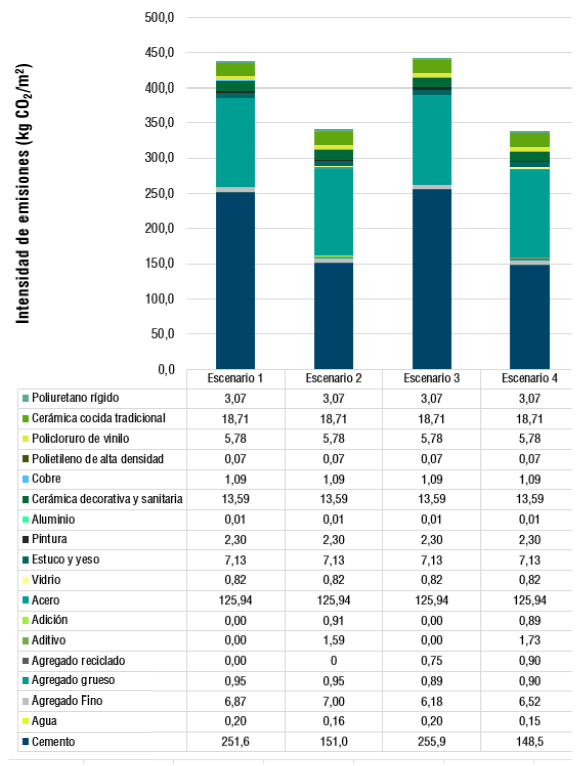 En la figura 3 se presenta la intensidad de emisiones (kg CO2/m2) de los materiales reportados por la constructora. Se observa que el cemento y el acero son los materiales de mayor impacto ambiental, asociado tanto a sus elevados factores de emisión como a su intensidad material. De acuerdo a lo observado en los diseños de mezcla, los escenarios 2 y 4 son los escenarios de menor huella de carbono, y el escenario 3 no presenta una disminución en el impacto ambiental de la edificación. Se resalta el hecho de que la huella de carbono de los cuatro escenarios se mueve en un rango entre 338,1 y 442,4 kg CO2/m2, consistente con investigaciones realizadas para el país para sistemas constructivos similares (Área Metropolitana del Valle de Aburrá et al., 2018).
