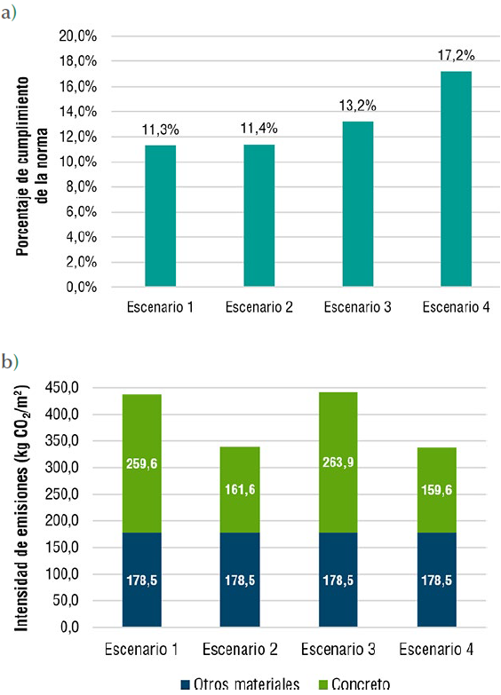 En la figura 4a se muestra el porcentaje de cumplimiento de la Resolución 0472 de 2017 y en la figura 4b se muestra la intensidad de emisiones (kg CO2/m2) discriminada para el concreto y los demás materiales reportados para cada escenario. En función del cumplimiento de la normativa, como se mencionó, los escenarios 3 y 4 son los que presentan mayor porcentaje, debido a que realizan sustituciones parciales de cemento por ceniza volante y sustituciones parciales de agregado virgen por agregado reciclado. Sin embargo, en función de la huella de carbono en la etapa de materiales son los escenarios 2 y 4 los que presentan menor cantidad de emisiones por metro cuadrado, ya que además de las sustituciones mencionadas, incluyen aditivo superplastificante, que al funcionar como agente reductor de agua y manteniendo la relación agua/cemento constante, complementa la reducción de cemento en los concretos planteados (Sika, 2017).