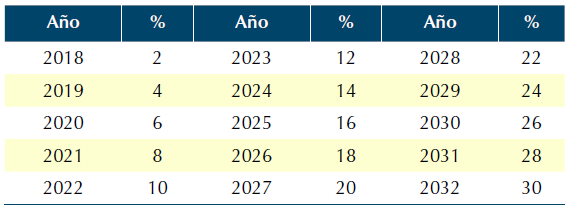 Los residuos de construcción y demolición (RCD) se refieren a cualquier residuo que se genere en una obra, producto de cualquier proyecto que incluya una actividad de construcción y demolición. Para Colombia, es el Ministerio de Ambiente y Desarrollo Sostenible el encargado de regular la gestión de los RCD, normalizada a través de la Resolución 0472 del 2017 (Ministerio de Ambiente y Desarrollo Sostenible, 2017), la cual establece el desarrollo de un programa de manejo ambiental (PMA) para construcciones con áreas de intervención iguales o superiores a 2000 m2. Este PMA consiste principalmente en acciones de prevención y reducción, recolección y transporte, almacenamiento, aprovechamiento y disposición final de residuos, haciendo énfasis en la clasificación de los RCD en Tipo 1.1 (Productos de excavación y sobrantes de la adecuación de terreno), Tipo 1.2 (Productos de cimentaciones y pilotajes), Tipo 1.3 (Pétreos) y Tipo 1.4 (No pétreos). Entre los lineamientos específicos del PMA resalta que a partir del 1 de enero de 2018 se debe incorporar el 2 % del peso total de los materiales con RCD aprovechables y cada año se incrementa un 2 % hasta alcanzar el 30 %. En la tabla 1 se presenta la meta correspondiente a cada año. Estas pueden lograrse a partir de materiales de construcción utilizados en la obra fabricados a partir de RCD (certificado por el fabricante), RCD aprovechados en la obra y/o RCD entregados a una planta de aprovechamiento. El reporte del PMA se lleva a cabo 30 días antes del comienzo de actividades de obra, de acuerdo a los RCD proyectados a generar, y 45 días después de finalizadas las actividades de construcción, de acuerdo a los RCD generados (Ministerio de Ambiente y Desarrollo Sostenible, 2017).