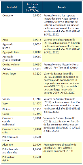 Para el cálculo de la huella de carbono de la etapa de extracción de la materia prima y fabricación de materiales de obra (kg CO2e/m2) se utilizó la norma NTC 14064-1 (ISO 14064-1, 2018). Para los factores de emisión se llevó a cabo una actualización de los consumos eléctricos del estudio de Salazar Jaramillo (2012), y se complementaron con una revisión bibliográfica. En la tabla 2 se presentan los factores de emisión (kg CO2/kg) utilizados para cada material, con su respectiva fuente.