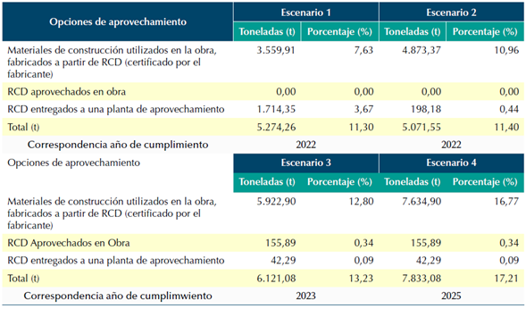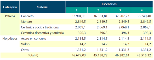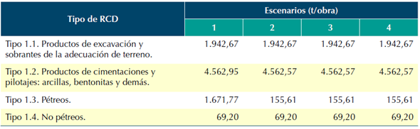 En la tabla 4 se presentan las proyecciones de generación de RCD por escenario. Se puede observar que la proyección de generación de RCD tipo 1.1 y 1.2 es la misma para los cuatro escenarios, ya que la cantidad de tierras de excavación y productos de cimentaciones no varía. De igual manera sucede para los RCD tipo 1.4, ya que el volumen de concreto a utilizar es el mismo. Sin embargo, la proyección de los RCD tipo 1.3 para los escenarios 2, 3 y 4 son diferentes a los del escenario 1, debido a que el porcentaje de desperdicio asumido para el escenario 1 es del 4 %, contrario al 0 % asumido para los demás escenarios, por tratarse de concretos premezclados.