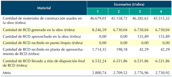 En la tabla 5 se presentan los indicadores por escenario. Se puede observar que para los RCD generados en la obra, el indicador en el escenario 1 es superior a los demás, debido a que el concreto preparado in situ mediante métodos tradicionales presenta un porcentaje de desperdicio superior a los concretos premezclados. Lo anterior conlleva a una afectación de los RCD recibidos en planta de aprovechamiento, debido a la necesidad de reciclar la cantidad de residuos pétreos asociados al concreto preparado en la obra del escenario 1. Para las metas, debido a que esto se calcula en función de la cantidad total de materiales, también se esperaba que los escenarios 1 y 2 fueran los de mayor y menor meta.