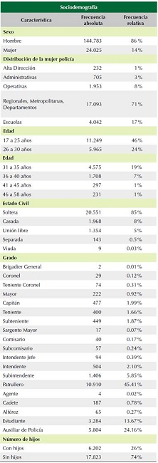 En la tabla 1 se presentan las características sociodemográficas, correspondientes a las 24.025 mujeres policías.