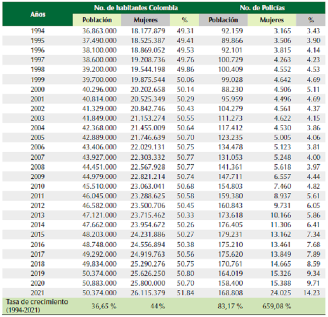 Caracterização, inclusão e participação de mulheres policiais na Colômbia. Análise 1994 - 2021