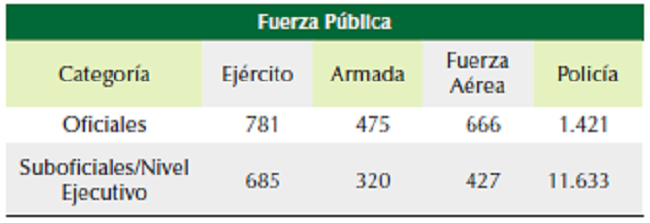 En un análisis comparativo con las Fuerzas Militares (Ejército, Armada y Fuerza Aérea), se evidencia que, para finales del 2017, última fecha de la cual se dispone información consolidada de carácter público, la representatividad de la mujer era del 5.8 % en las tres fuerzas respecto a los hombres, mientras que, para la Policía Nacional, en el mismo año, las uniformadas representaban el 7.8 °% de la población policial, como se evidencia en la tabla 3.