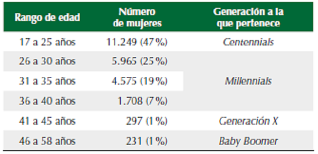 En la tabla 4, se agrupa el número de mujeres, por rango de edades, con el fin de determinar la generación correspondiente al grupo etario al que pertenecen.