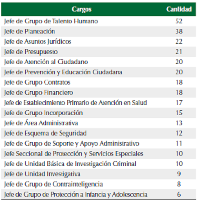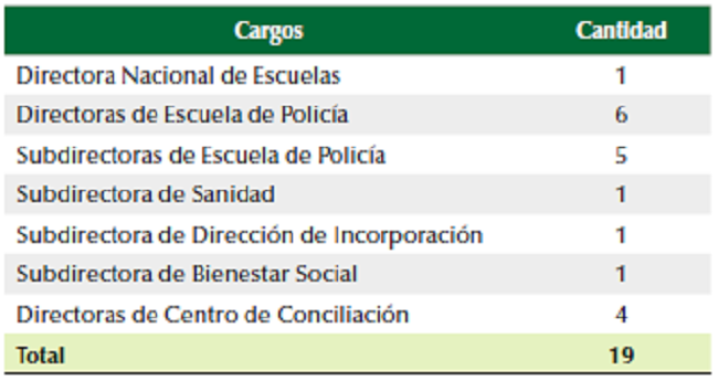 Si bien la Policía Nacional está exenta de cumplir lo estipulado en la Ley 581 de 2000, también denominada Ley de Cuotas de Género en la Función Pública, en lo concerniente al artículo 2 (Concepto de máximo nivel decisorio) y el artículo 3 (Concepto de otros niveles decisorios), en la actualidad la institución ha generado espacios de inclusión y participación de la mujer, permitiendo que las mismas lleguen a ocupar cargos directivos, de jefatura y comandantes dentro de la estructura organizacional. La tabla 5 presenta los cargos más relevantes ejercidos por mujeres como directoras y subdirectoras.