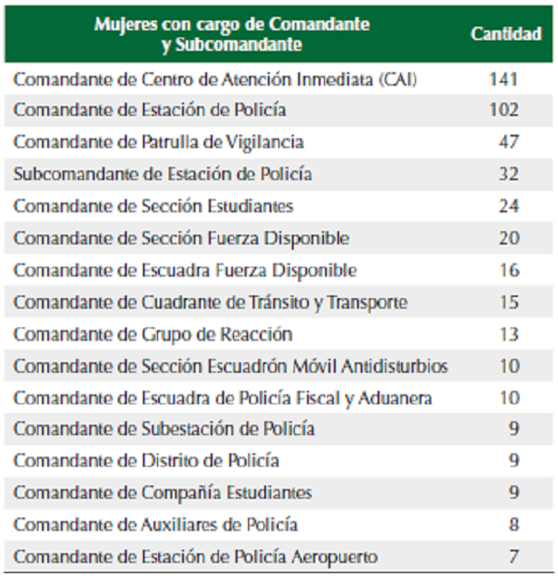 La tabla 7 permite evidenciar que, del total de mujeres en la institución, 571 (2.3 °%) ocupan cargos como Comandante, de las cuales el mayor porcentaje (24 %) se desempeñan como Comandantes de Centros de Atención Inmediata (CAI), seguido de aquellas que comandan Estaciones de Policía (17 °%).