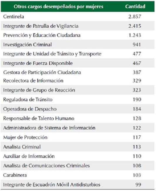 En la actualidad existen 645 mujeres que ostentan grados de jefatura, describiéndose en la tabla 6 los cargos con mayor representación que son ejercidos a nivel institucional; es pertinente en este caso indicar que, en la actualidad, el 3 % del total de la población de uniformadas ocupa este tipo de cargos.