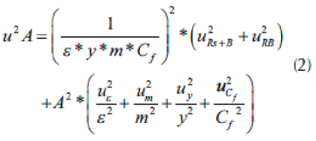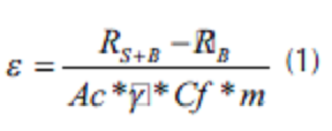 En la ecuación, RS+B corresponde a la tasa bruta de conteo en el fotopico de interés de la muestra y el fondo, RB a la tasa bruta de conteo en el fotopico de interés del fondo, Ac a la concentración de actividad del radionúclido en el material de referencia, Y a la probabilidad de emisión gamma para la energía de interés, Cf al factor de corrección y m a la masa del MRC, respectivamente.