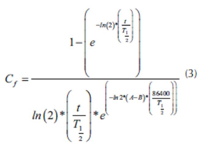 El 131I se caracteriza por contar con un periodo de semidesintegración de 8.02 días, lo cual implica que durante el tiempo transcurrido entre el muestreo y análisis, así como en el mismo tiempo de análisis la concentración de actividad de las muestras puede presentar variaciones, por lo que en consecuencia se aplicó un factor de corrección de decaimiento dado por la ecuación 3.