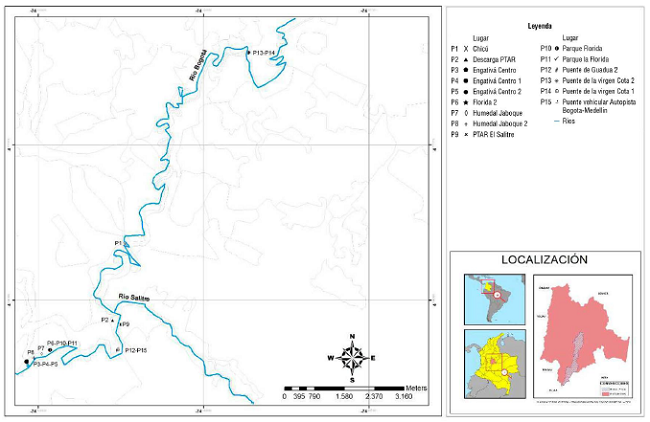 La del¡m¡tac¡ón del área de estud¡o se llevó a cabo selecc¡onando tre¡nta puntos de muestreo a lo largo de la cuenca med¡a del río Bogotá (figuras 1 y 2), desde el mun¡c¡p¡o de Cota en el puente de La V¡rgen hasta antes del embalse de Muña en Soacha. Los vert¡m¡entos de la cuenca med¡a prov¡enen de los tres pr¡nc¡pales ríos de la c¡udad, el Sal¡tre, el Fucha y el Tunjuelo, y son de t¡po domést¡co, ¡ndustr¡al y hosp¡talar¡o, entre otros.