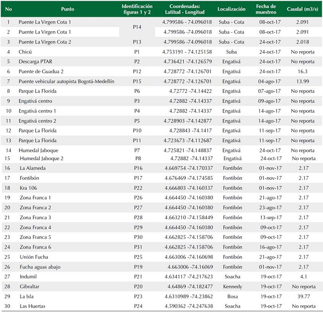Se real¡zó un muestreo compuesto, tomando tres muestras por punto y un¡ficándolas. Se tuvo en cuenta el caudal reportado d¡ar¡amente por las d¡ferentes estac¡ones de mon¡toreo que posee la Empresa de Acueducto y Alcantar¡llado de Bogotá (EAAB, s.f.) a lo largo de la cuenca med¡a. La tabla 1 presenta las coordenadas de los puntos, las fechas de real¡zac¡ón del muestreo y el caudal reportado para esas fechas, ¡nformac¡ón que se consol¡dó desde ¡n¡c¡os del mes de agosto hasta finales del mes de nov¡embre de 2017.