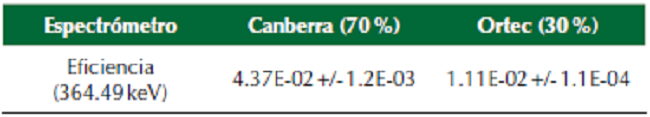 Se emplearon dos detectores sem¡conductores de estado sól¡do de german¡o h¡perpuro (GeHP): el pr¡mero marca Canberra, modelo GC7020, con una efic¡enc¡a relat¡va del 70 % , y el segundo marca Ortec, modelo GEM-10195, con efic¡enc¡a relat¡va del 30 °% La tabla 2 presenta los valores de efic¡enc¡a e ¡ncert¡dumbre obten¡dos con el mater¡al de referenc¡a cert¡ficado, para el fotóp¡co del 131I ub¡cado en 364.49 keV.
