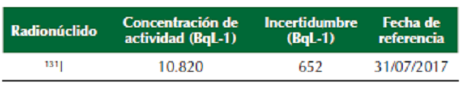 La concentración de actividad reportada en la tabla 5 corresponde a la presencia de 131I en la fecha y hora de toma de la muestra.