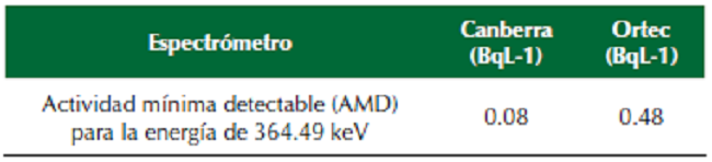 La actividad mínima detectable (AMD) varía con la naturaleza de la muestra (Gascó et al., 2009), pues para su cálculo se consideran variables como la concentración de actividad de la misma, la eficiencia del sistema espectrométrico y el tiempo de análisis. Para su determinación se empleó la ecuación suministrada por la norma ISO 1 1929:2010. La tabla 4 presenta la AMD obtenida en los sistemas espectrométricos empleados con la geometría de análisis característica.