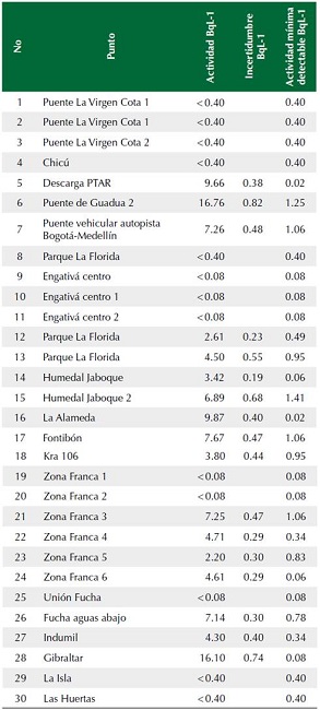 Las mayores concentraciones de actividad de 131I se encontraron en el punto conocido como Puente de Guadua, en la localidad de Engativá, y en el punto ubicado en la estación de bombeo de Gibraltar, situado en la localidad de Kennedy, con 16.8 y 16.1 BqL-1, respectivamente, seguido de puntos como La Alameda en Fontibón, con 9.87 BqL-1, y Lisboa en Suba, con 9.66 Bq L-1. Debido a que existen fluctuaciones espaciotemporales, por la descarga de aguas a la cuenca del río Bogotá a lo largo de su recorrido, dentro de las que se encuentran descargas hospitalarias y afluentes, no es posible establecer una correlación entre la actividad encontrada en los puntos de muestreo. También es importante considerar que no fue posible tomar todas las muestras en un mismo día.