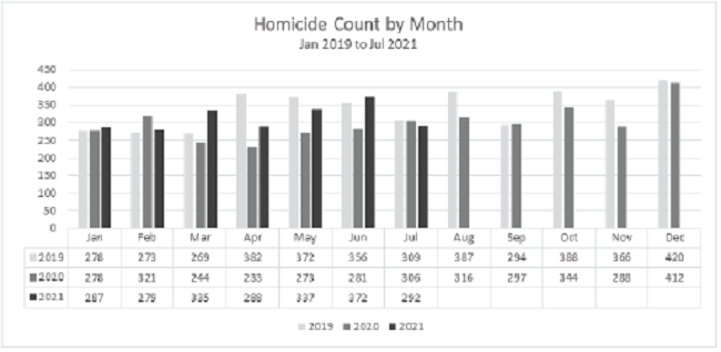 During the last decade, Honduras has frequently appeared among the most violent countries in the world (Asmann & Jones, 2021; UNODC, 2019). Even so, homicide rates have been steadily trending downward, though the rates continue to be very high compared with most of the world (UNODC, 2019). Homicide rates be tween 2011 and 2018 steadily declined before making a slight upturn in 2019 to 41.2 homicides per 100,000 in the population (see figure 3). During the COVID-19 pandemic, data provided by the HNP show monthly incidents of homicide in 2020 were consistently fewer than 2019 in the first months of the pandemic. In 2019, the daily mean of homicides in Honduras was 11.2, and this dropped to 9.8 in 2020. In 2021, homicides are trending upward, despite the continuation of COVID-19 travel restrictions and curfews. In fact, the number of homicides in March and June 2021 are higher than 2020 and 2019, though the mean for the first seven month of 2021 (10/3/day) is still lower than the 2019 mean (DPPOMC/ SEPOL, 2021).