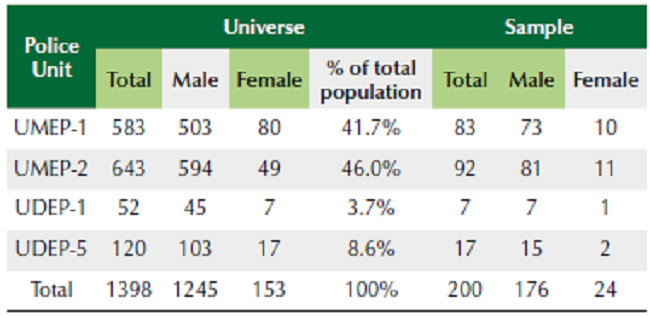 Métodos: Usando métodos mistos, este artigo relata os resultados descritivos de 28 entrevistas qualitativas semiestruturadas com altos funcionários da Polícia Nacional de Honduras (PNH) e uma amostra representativa de 143 policiais de patrulhamento dos distritos policiais de Tegucigalpa, San Pedro Sula, La Ceiba e La Lima.