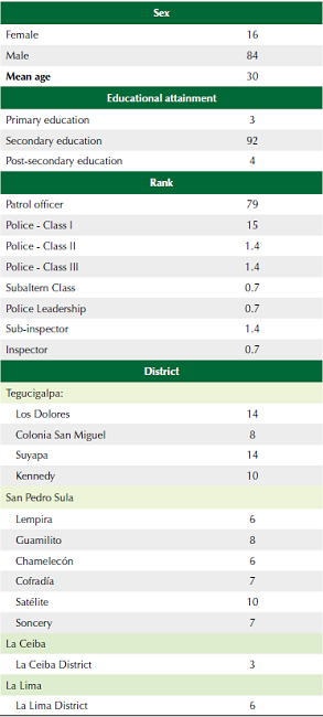 Métodos: Utilizando métodos mixtos, este artículo reporta los resultados descriptivos de 28 entrevistas cualitativas semiestructuradas con altos mandos de la Policía Nacional de Honduras (PNH) y una muestra representativa de 143 patrulleros provenientes de distritos policiales de Tegucigalpa, San Pedro Sula, La Ceiba y La Lima.