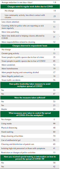 Resultados: As atividades policiais relacionadas à prevenção do crime, investigações e alocação de recursos humanos mudaram em Honduras devido ao COVID-19. Poucos protocolos policiais foram atualizados para refletir esse novo ambiente de trabalho, e as medidas para proteger o bem-estar dos policiais tem sido inconsistentes, levando a um aumento dos níveis de estresse entre os policiais.