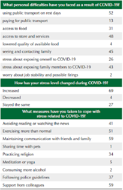 Based on their experiences and observations during the first months of the pandemic, the police supervisors consistently reported perceived shifts in criminal activity with decreases in extortion, robberies, and homicides, and increases in domestic and intrafamilial violence, though drug trafficking networks continued to operate regularly. Data from the National Emergency System indicated that during March-April 2020 there were 20.0 % fewer reports of crimes against property and 27.0 % fewer reports of crimes against life, compared to March-April 2019. Lastly, the results of the semi-structured interviews showed that police workloads dramatically increased following the lockdown requirements announced by the Government. Subjects attributed this increase at least in part to requirements for expanded police checkpoints at the municipal entry and exit points to monitor travel restriction compliance. Besides investing significant resources into community public health campaigns by distributing informational flyers in communities, police also worked to establish sanitary perimeters around medical facilities and supported the national forensic and public health agencies in the disposal of victims' bodies. All the supervisors surveyed expressed their concerns about the cumulative toll on the physical and emotional health of the police force because of these activities. Informed by the responses of these command staff, the second phase of this study examines the impact of COVID-19 on the individual experiences of patrol officers.