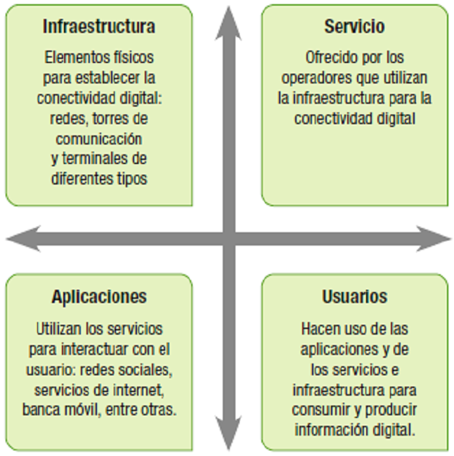 La Fundación Telefónica (2016) ha sido la encargada de analizar a profundidad la relación que existe entre los cuatro componentes del ecosistema digital, desde su origen, con las problemáticas que reviste su regulación como una política TIC. En la figura 1 se presentan las principales características de estos elementos: infraestructura, servicio, aplicaciones y usuarios.