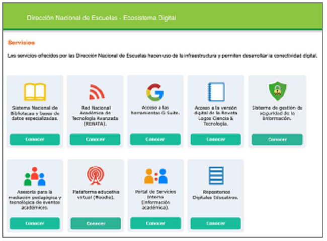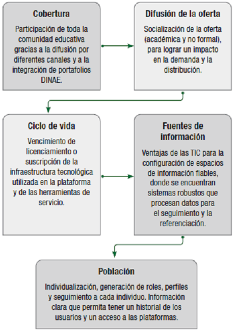 Con los instrumentos aplicados y analizados en la fase de diagnóstico se lograron identificar las principales necesidades de los usuarios sobre servicios, infraestructura, información y ofertas de formación de las diferentes plataformas existentes en la DINAE. Esto permitió definir la manera de articularlas y optimizarlas en un ecosistema digital, tal como se presenta a continuación.