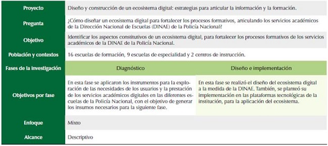 El ecosistema digital surge, bajo la perspectiva de Pineda y Orozco (2017), como un insumo para la consolidación de las metas fijadas para responder a las exigencias tecnológicas, a través de un acompañamiento activo a la institución en la prestación del servicio. Por consiguiente, en el marco de la apropiación de las TIC y de su contribución a los entornos sociales y educativos, se planteó la siguiente pregunta que orientó la propuesta: ¿cómo diseñar un ecosistema digital para fortalecer los procesos formativos, articulando los servicios académicos de la DINAE de la Policía Nacional de Colombia?