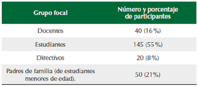 Con el propósito de obtener información relevante de los diferentes usuarios, la población de estudio estuvo conformada por estudiantes, docentes, directivos académicos y padres de familia. En cuanto a la muestra, se realizó una elección no probabilística por conveniencia, porque su selección obedece a los intereses y propósitos de la investigación; además, por la disponibilidad y por la cercanía con el investigador (Hernández et al., 2010). Se contó con la participación de 16 escuelas de formación policial pertenecientes a la DINAE, 9 de especialidades y 2 centros de instrucción de la Policía Nacional. La siguiente categorización evidencia el trabajo desarrollado con el personal de: