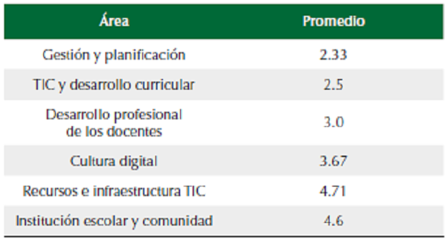 En cuanto al desarrollo profesional de los docentes y la cultura digital institucional, los participantes valoraron con una escala promedio los procesos que se llevan a cabo en la DINAE. Por otra parte, se otorga una calificación alta a los aspectos relacionados con los recursos e infraestructura TIC con los que se cuenta en la organización, así como a la incorporación de estas tecnologías en la institución educativa y en la comunidad.