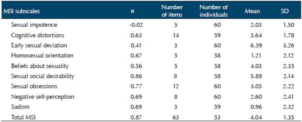 Regarding internal reliability and correlations between MSI subscales, the results obtained are satisfactory for several subscales and for the whole MSI used in subsequent analyses, while, besides that, they force us to review sexual impotence subscale and the one on early sexual deviation. However, the correlations profile between MSI subdimensions, as expected, given the high coefficient of internal reliability of the whole scale, is consistent, for example, more cognitive distortions, more sexual obsessions, earlier interest in sexuality, less sexual social desirability.