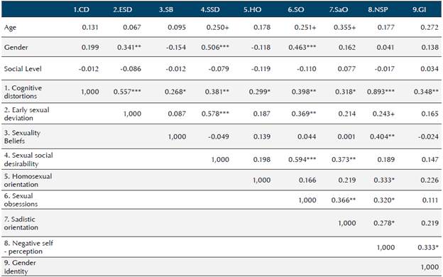 Early sexual deviation was associated with lower social desirability and with a higher score in sexual obsessions, while erroneous sexual beliefs were associated with a negative self-perception, and sexual obsessions were directly associated with a sadistic orientation. On the other hand, homosexual orientation was directly associated in a moderate way with distortions and immaturity (also with worst self-perception), and greater nonconformity with one's gender (gender identity) was also associated with greater immaturity and negative self-image. In addition to the above, other groups of significant correlations were found, although at a lower level than those already mentioned. Thus, older age is tendentially associated with social desirability, obsessions, and a sadistic orientation.