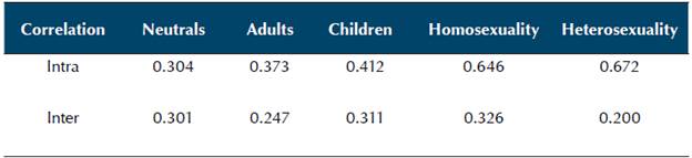 As an indirect measure of the internal reliability of visual stimuli used in this task, mean correlations of reaction times between images of a given category, for example, neutral stimuli- and mean correlations between the other stimuli were calculated. Mean correlation between the same category stimuli is called "intra-category correlation", and mean correlation between each category and the other VRT is called "inter-item correlation". If inter-item correlation is equal to or greater than intra-category correlation, said category has low internal consistency; on the contrary, if intra-category correlation is higher than that of the rest of the items, the category has a reasonable internal consistency, that is, it is assumed that items of said category measure the same areas -neutral, adults, homosexuality, etc.