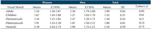 Secondly, in relation to VRT data distribution, three indicators met normality criteria for women according to the Shapiro-Wilk test, suitable for samples of less than 50 individuals, and two presented a non-normal distribution: adults images [Saphiro-Wilk (16) = .885, p <.05] and homosexual couples images [Shapiro-Wilk (16) = .853, p <.05], while men presented a non-normal data distribution only in the RT of children images [Saphiro-Wilk (14) = 0.907, p <.01].