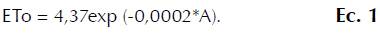 Se establece la relación exponencial entre la evapotranspiración de referencia (ETo) y la altitud, y para estimar la evapotranspiración se propuso la expresión empírica presentada en la ecuación 1, aplicable en estudios generales de zonificación climática de las cuencas de los ríos Cauca y Magdalena, localizadas en la región Andina de Colombia, para altitudes entre 170 y 3.700 msnm. (p. 17)